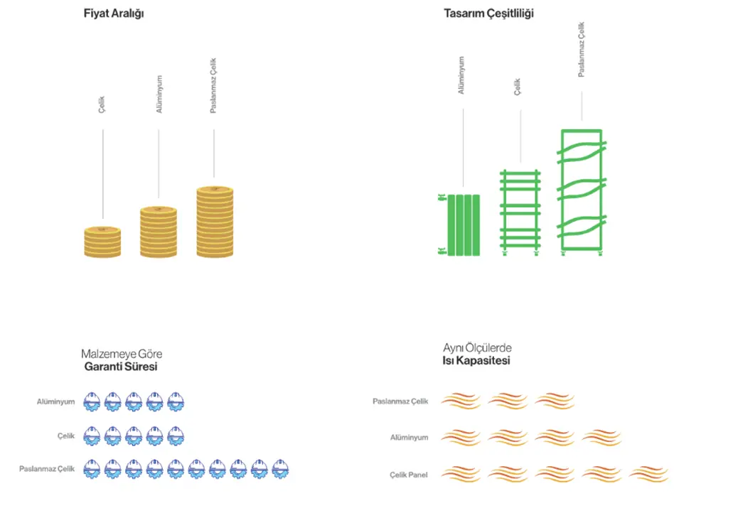 **Paslanmaz Çelik malzemesi, Çelik ve Alüminyum malzemelere göre daha düşük ısı iletkenliğine sahiptir. Bu nedenle Paslanmaz çelik ham maddesi kullanılarak imal edilen radyatörler, ne kadar iyi tasarlanırlarsa tasarlansınlar, Alüminyum radyatörlere göre daha düşük ısı kapasitesine sahiptirler. Bu nedenle Radyatör tasarımlarımızda Alüminyum malzeme tercih etmekteyiz. Paslanmaz havlupanlar farklı ısı kaynaklarının olduğu (sıcak su vb.) ve sürekli içinde yaşanmadığı için ısı ihtiyacının daha düşük olduğu banyolarda dekoratif ve uzun ömürlü olmaları nedeni ile tercih edilmektedir.