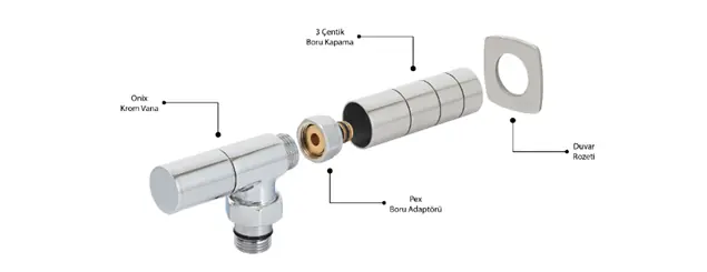 Pex adaptörü= Hammam Vana Paketiniz içindeki vana ½’’ (yarım parmaktır). Vana paketinize ayrıca tesisatınızın Pex bağlantılı olması ihtimaline karşı PeX adaptörü içerir. Bu parça yarım parmak vanayı PeX tesisat bağlantısına uyumlu hale dönüştürecek ara parçadır. Eğer bağlantınız PPRC ise bu adaptörü kullanmanız gerek kalmayacaktır. Tesisatınız PPRC mi? PeX mi? diye düşünmenize gerek kalmaz!